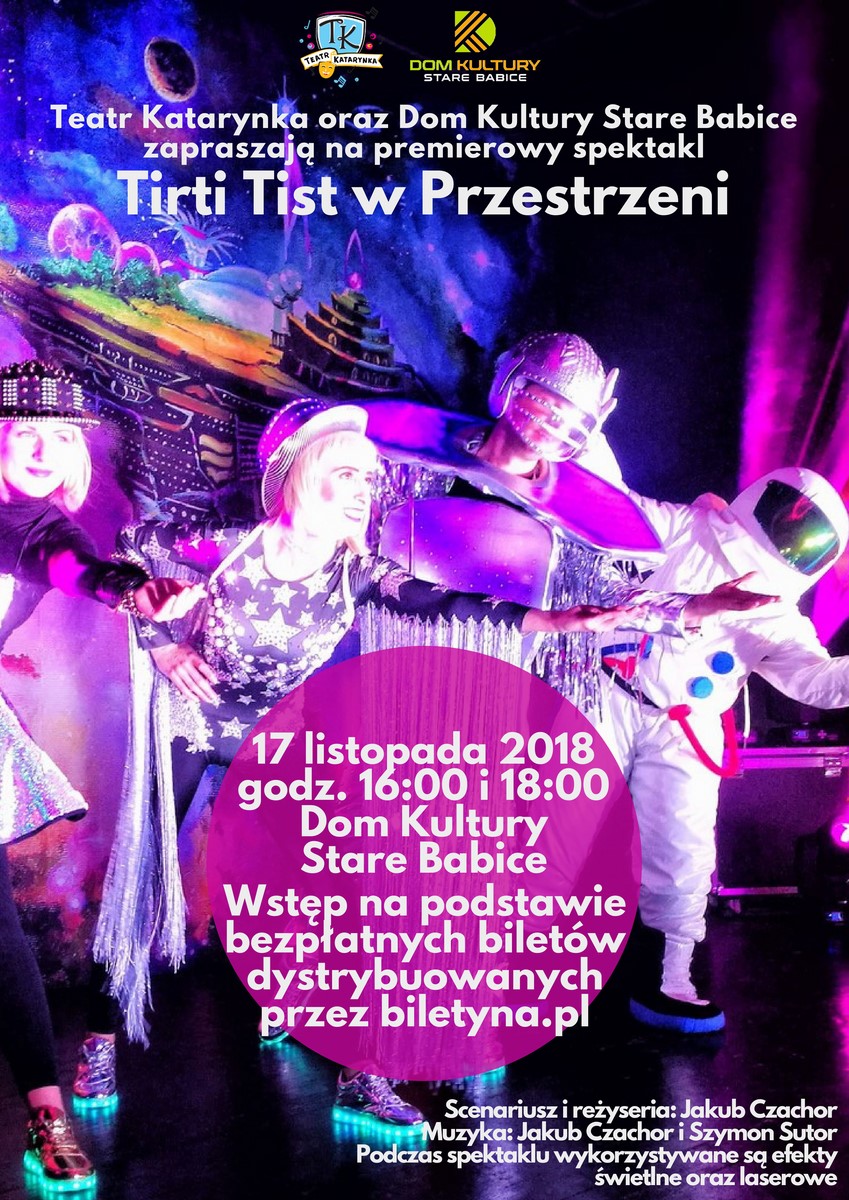 Tirti Tist w Przestrzeni – spektakl premierowy odbędzie się 17 listopada 2018 roku, o godzinie 16:00 oraz 18:00 w Domu Kultury Stare Babice (ul. Południowa 2A, 05-082 Zielonki-Parcela).